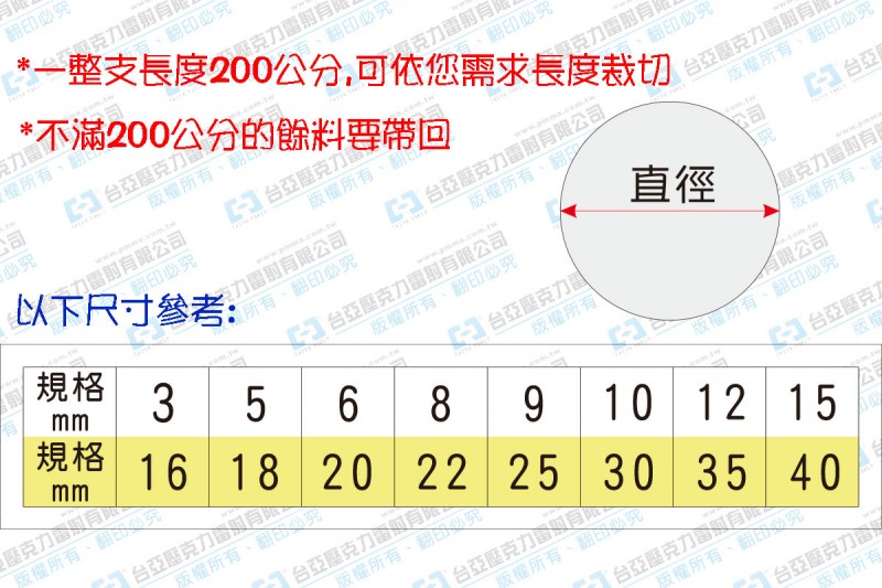 1.直徑3~40mm一整支長度200公分,可依您需求長度裁切(不滿200公分的餘料要帶回)