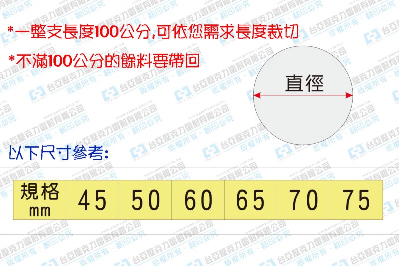 2.直徑45~75mm一整支長度100公分,可依您需求長度裁切(不滿100公分的餘料要帶回)
